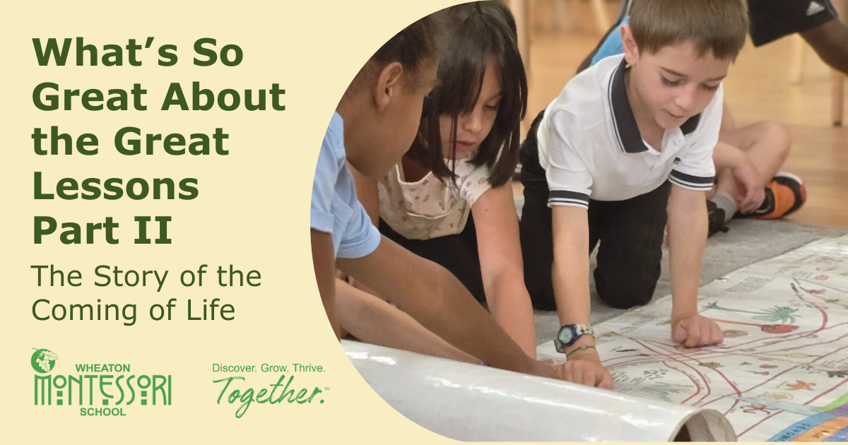 The children are fascinated by this story, which sets up for them the basic laws that govern all living things, providing a framework for the biology work they will undertake in the elementary classrooms at Wheaton Montessori School. It also serves as an epic tale of how the earth was prepared for the coming of one very special animal that was unlike any other…us!